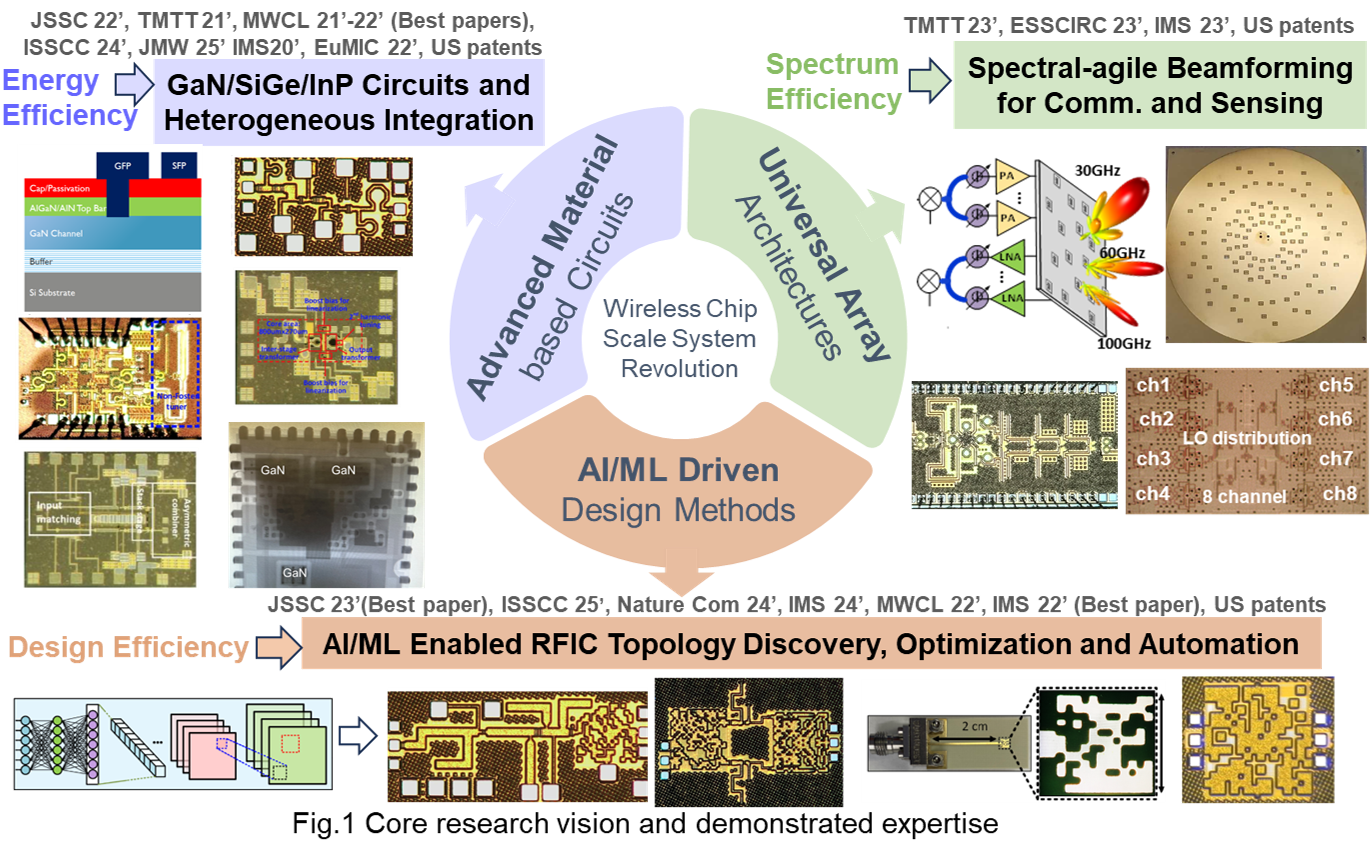 Addressing the multi-tiered challenges of future intelligent wireless chip-scale systems—from bit to THz, and from communication to sensing—requires a transformative co-design approach, which integrates algorithms, architectures, and circuits to achieve better performance and design productivity across diverse applications (ie. integrated communication, sensing and power beaming). The approach is expected to leverage AI to discover new design spaces and accelerate design cycles; to develop universal system architectures adaptable to diverse spectrum and applications; and to enhance circuits and devices through beyond-silicon materials to achieve unprecedented performance. Therefore, my research vision is founded on these three pillars: 1) Smarter wireless chip design beyond human intuition through AI/ML-driven methodologies; 2) Greater wireless system universality through novel phased array architectures; 3) Superior circuits and electromagnetics performance through advanced materials and co-design.